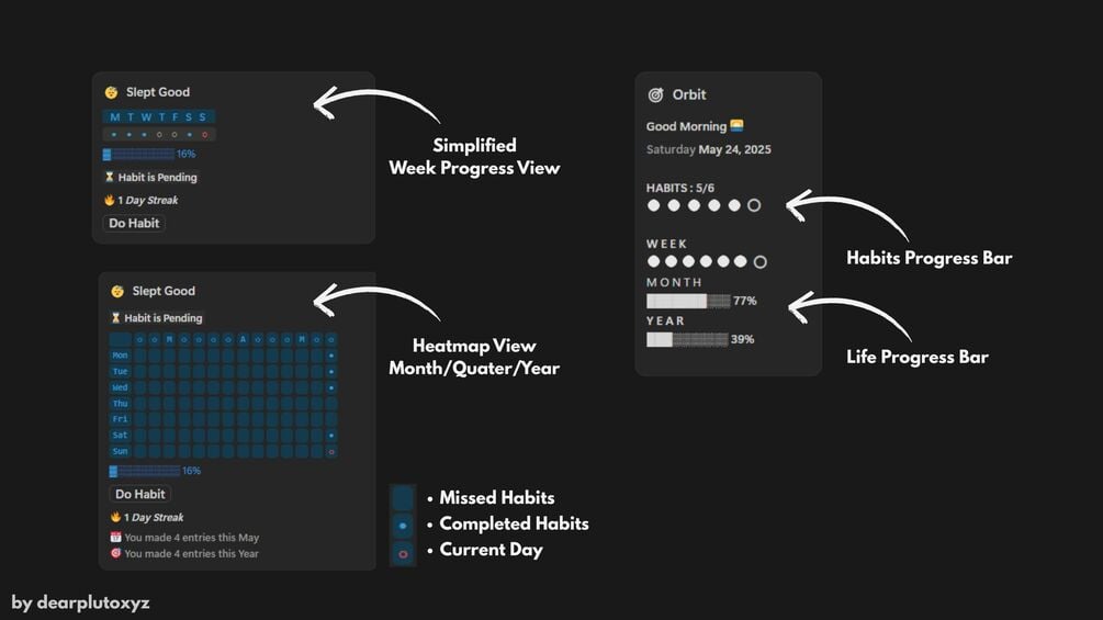Includes organized habit categories with both desktop and mobile optimization. Track everything from morning routines to evening wind-downs with beautiful GitHub-style heatmaps that show your consistency over time.