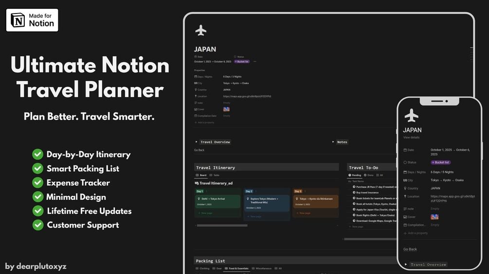 A comprehensive travel planning system that combines proven organization methods into one streamlined workspace. This template integrates multiple travel frameworks:
